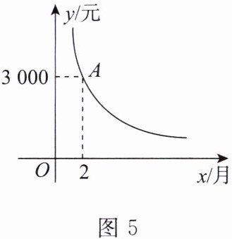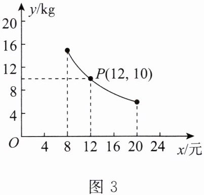 5. 某商家出售一种零食,在销售过程中,该商家发现这种零食的日销售量$ y(kg) $与日销售单价x(元)之间成反比例函数关系,它的图象如图3所示。