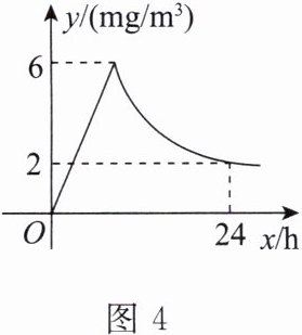 6. 每年春季为预防流感,某校利用休息日对教室进行药熏消毒,已知药物燃烧过程及燃烧完后空气中的含药量$ y(mg/m^3) $与时间x(h)之间的关系如图4所示,根据消毒要求,空气中的含药量不低于$ 3mg/m^3 $且持续时间不能低于10h。请你帮助计算一下,当空气中的含药量不低于$ 3mg/m^3 $时,持续时间可以达到