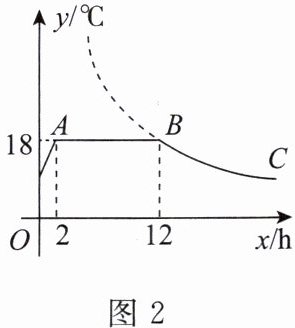 4. 某蔬菜大棚恒温系统从开启到关闭,大棚内温度$ y(^{\circ}C) $随时间 x(h) 变化的函数图象如图2所示,其中BC段是反比例函数图象的一部分,则当$ x = 20 $时,大棚内的温度为