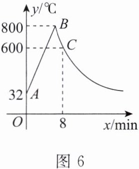 8. 工匠制作某种金属工具要进行材料煅烧和锻造两个工序,即需要将材料烧到$ 800^{\circ}C $,然后停止煅烧进行锻造操作,经过8min时,材料温度降为$ 600^{\circ}C $。煅烧时,温度$ y(^{\circ}C) $与时间x(min)成一次函数关系;锻造时,温度$ y(^{\circ}C) $与时间x(min)成反比例函数关系(如图6)。已知该材料初始温度是$ 32^{\circ}C $。