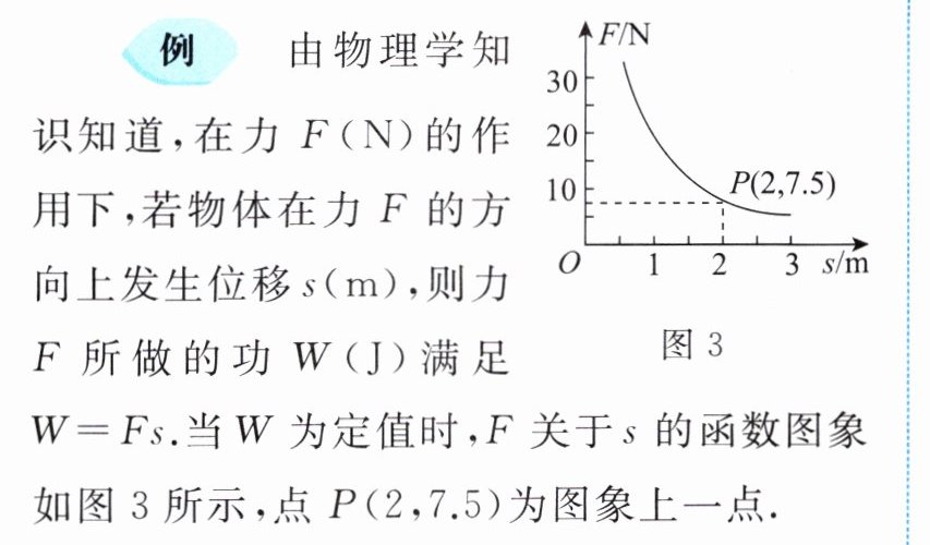 解析 (1)根据点 $P(2,7.5)$ 为图象上一点,把 $s = 2$,$F = 7.5$ 代入 $W = Fs$ 求出 $W$,即可确定 $F$ 关于 $s$ 的函数解析式。