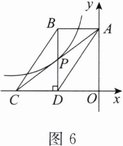 14. 如图 6,反比例函数 $ y = \frac{k}{x} $ 的图象经过 $ □ ABCD $ 对角线的交点 $ P $,已知点 $ A $,$ C $,$ D $ 在坐标轴上,$ BD \perp DC $,$ □ ABCD $ 的面积为 6,则 $ k = $