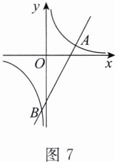 16. (14 分)如图 7,一次函数 $ y = mx + b $ 的图象与反比例函数 $ y = \frac{k}{x} $ 的图象交于 $ A(3, 1) $,$ B(-\frac{1}{2}, n) $ 两点。