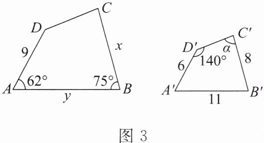 例 2 如图 3,已知四边形 $ABCD$ 和四边形 $A'B'C'D'$ 相似,求 $x$,$y$ 的值和 $\angle \alpha$ 的度数.