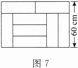 (1)设每块地砖的长为$x\ cm$,宽为$y\ cm$。由图形密铺可知,大矩形的高度为$60\ cm$,且满足$\begin{cases}x + y = 60\\x = 3y\end{cases}$,解得$\begin{cases}x = 45\\y = 15\end{cases}$。故每块地砖的长为$45\ cm$,宽为$15\ cm$。