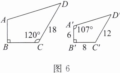 5. 如图 6,已知四边形 $ABCD$ 和四边形 $A'B'C'D'$ 相似,分别求 $AB$,$BC$ 的长及 $\angle D$ 的度数.