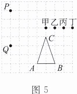 2. 如图 5,若 $A$,$B$,$C$,$P$,$Q$,甲、乙、丙、丁都是方格纸中的格点,为使△ABC∽△PQR,则点 $R$ 应是甲、乙、丙、丁四点中的(