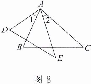 2. 如图 8,已知 $\frac{AB}{AC} = \frac{AD}{AE}$,且 $\angle 1 = \angle 2$,则下列结论不一定正确的是(