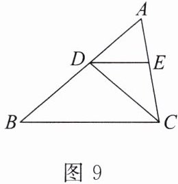 5. 如图 9,在△ABC 中,点 $D$ 在边 $AB$ 上,点 $E$ 在边 $AC$ 上,$DE // BC$,$\angle B = \angle ACD$,则图中相似三角形共有