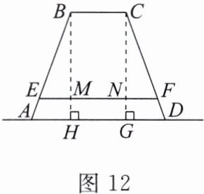 7. 某高中为高一新生设计的学生板凳的正面视图如图12所示,其中BA= CD,BC= 20cm,BC,EF平行于地面AD且到地面AD的距离分别为40cm,8cm。作BH⊥AD于点H,交EF于点M,作CG⊥AD于点G,交EF于点N。为使板凳两腿底端A,D之间的距离为50cm,那么横梁EF应为多长?(材质及其厚度等忽略不计)
