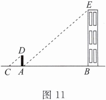 5. 小明在测量楼高时,先测出楼房落在地面上的影长BA为15m(如图11),然后在A处竖立一根高2m的标杆,测得标杆的影长AC为3m,则楼高BE是多少米?