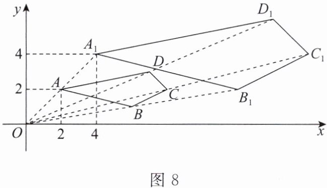 4. 如图8,面积为$6的四边形ABCD与四边形A_1B_1C_1D_1是以原点O$为位似中心的位似图形,对应点$A$,$A_1的坐标分别是(2,2)$,$(4,4)$,则四边形$A_1B_1C_1D_1$的面积为