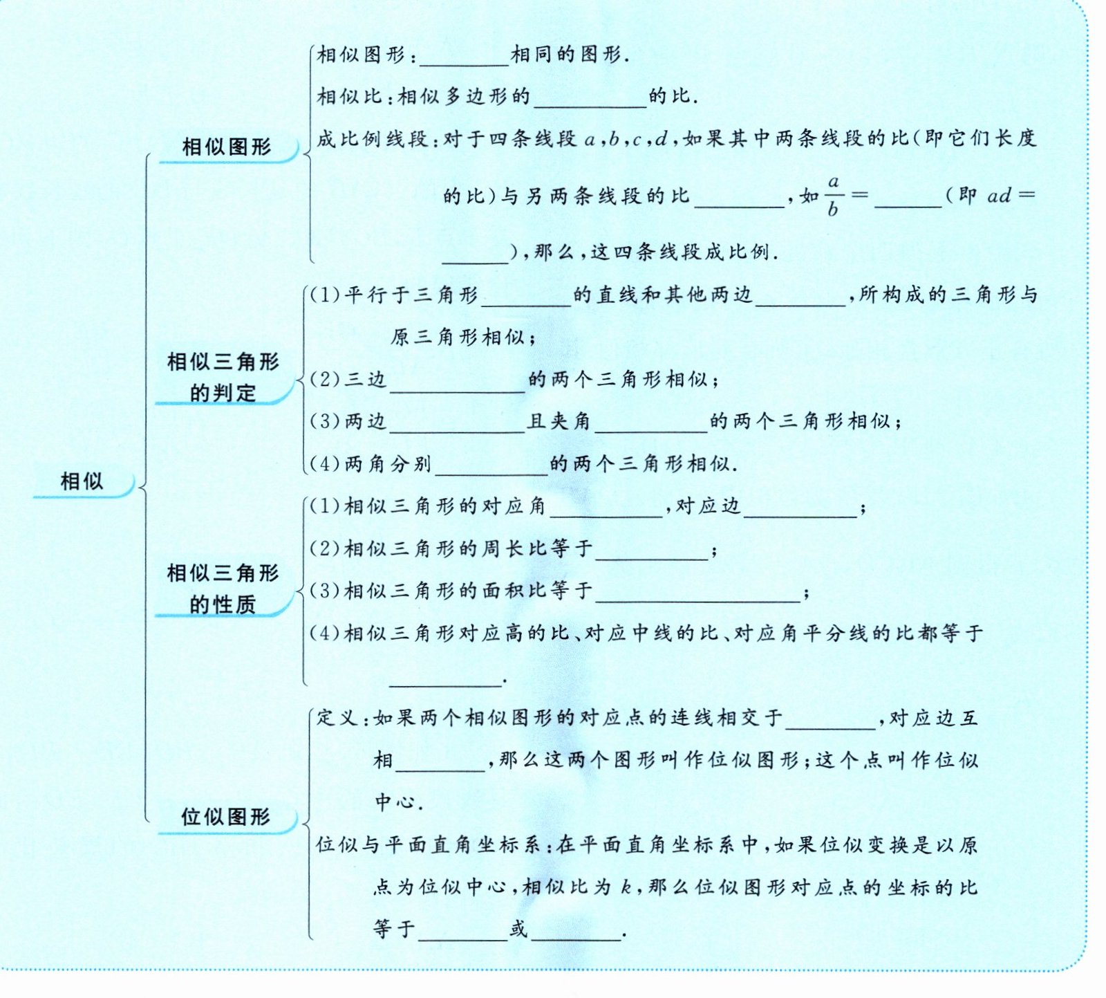 形状;对应边;相等;$\frac{c}{d}$;$bc$;一边;相交;成比例;成比例;相等;相等;相等;成比例;相似比;相似比的平方;相似比;一点;平行;$k$;$-k$