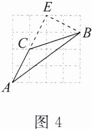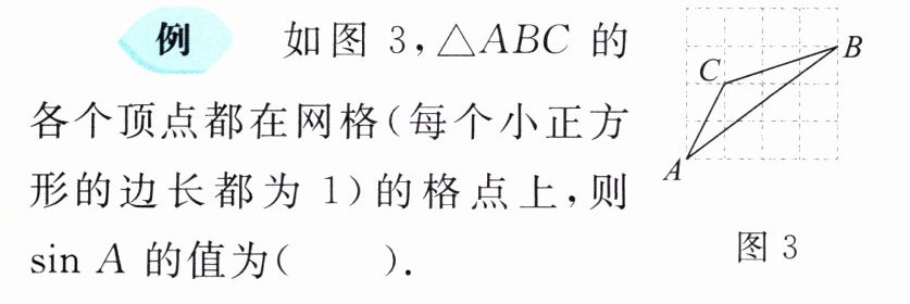 解析 求 $\angle A$ 的正弦值,需把 $\angle A$ 放在某直角三角形中,为此,作出以下辅助线:如图 4,延长 $AC$ 交网格于点 $E$,连接 $BE$. 可得 $\triangle ABE$ 是直角三角形,再由正弦的定义求 $\sin A$ 的值.