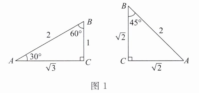 小锦囊 特殊锐角的三角函数值是中考必考的内容,要熟练记忆 $30^{\circ}$,$45^{\circ}$,$60^{\circ}$ 角的三角函数值,可借助如图1所示的三角板记忆。