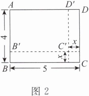 4. 如图2,已知矩形 $ ABCD $ 的长为 $ 5cm $,宽为 $ 4cm $。将它的长和宽都减去 $ xcm $,设剩下的小矩形 $ AB'C'D' $ 的面积为 $ ycm^{2} $。
