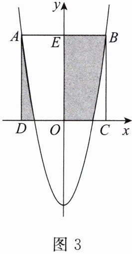 (2) 如图 3,此二次函数的图象经过点 $ (0, -4) $,正方形 $ ABCD $ 的顶点 $ C $,$ D $ 在 $ x $ 轴上,$ A $,$ B $ 两点恰好在二次函数的图象上,求图中阴影部分的面积之和。