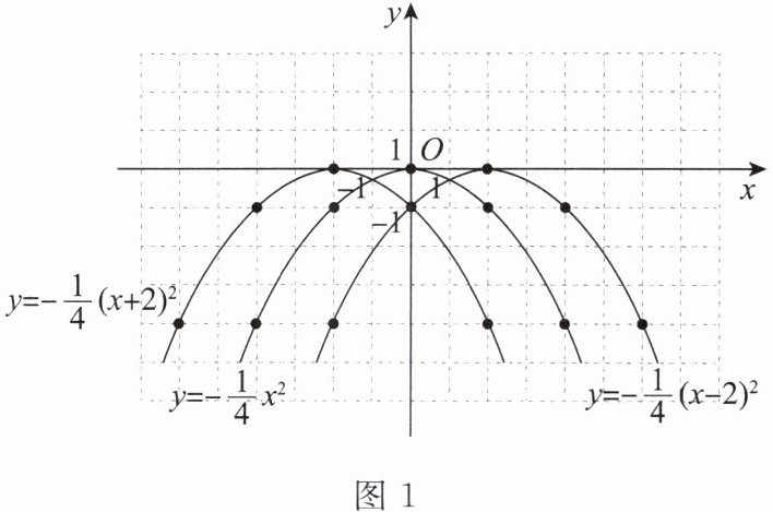 解 (1)列表(略)、描点、连线得函数 $ y = -\frac{1}{4}x^2 $,$ y = -\frac{1}{4}(x + 2)^2 $,$ y = -\frac{1}{4}(x - 2)^2 $ 的图象,如图 1 所示。