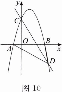 6. 如图 10,已知抛物线 $ y = -x^{2} + mx + 3 $ 与 $ x $ 轴交于 $ A $,$ B $ 两点,与 $ y $ 轴交于点 $ C $,点 $ B $ 的坐标为 $ (3,0) $,抛物线与直线 $ y = -\frac{3}{2}x + 3 $ 交于 $ C $,$ D $ 两点,连接 $ BD $,$ AD $。