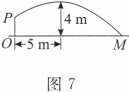 2. (2024广西中考)如图7,壮壮同学投掷实心球,出手(点$P$处)的高度$OP是\frac{7}{4}m$,出手后实心球沿一段抛物线运行,到达最高点时,水平距离是$5m$,高度是$4m$。若实心球落地点为$M$,则$OM = $