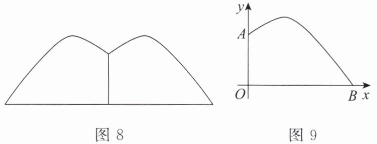 3. 某地要建造一个圆形喷水池,在水池中央垂直于水面安装一根柱子$OA$,$O$恰好在水面中心,安装在柱子顶端$A$处的喷头向外喷水,水流在各个方向上沿形状相同的抛物线路径落下,且在过$OA$的任一平面上,抛物线的形状如图8所示。建立如图9所示的平面直角坐标系,水流喷出的高度$y(m)与到柱子OA的水平距离x(m)满足关系式y = -x^2 + 2x + 1.25$。
