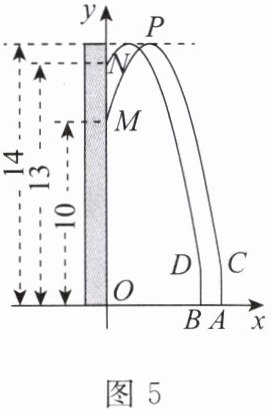 2. 在全国消防安全宣传教育日,某区消防中队开展技能比赛。如图5,考官分别在一幢废弃高楼的$M$,$N$两处设置了火源,$OM = 10m$,$ON = 13m$。随后消防甲队来到高楼的正前方,估计高度后,消防员站在$A$处,拿着水枪距地面一定高度(点$C$)喷出水,水流划过一道抛物线,准确落在$M$处,待$M$处火熄灭后,消防员向正前方移动到$B$处,水流达到最高点后,落在$N$处。已知第一次水流在与楼房水平距离为$2m的点P$处达到最大高度,最大高度为$14m$。