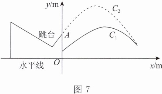 17.(16 分)图 7$img$ (见下一页)是某跳台滑雪训练场的横截面示意图,取某一位置的水平线为 $ x $ 轴,过跳台终点 $ A $ 作水平线的垂线为 $ y $ 轴,建立平面直角坐标系。图中的抛物线 $ C_1: y = -\dfrac{1}{12}x^2 + \dfrac{7}{6}x + 1 $ 近似表示滑雪场地上的一座小山坡,某运动员从点 $ O $ 正上方 4 m 处的点 $ A $ 滑出,滑出后的运动路径近似于抛物线 $ C_2: y = -\dfrac{1}{8}x^2 + bx + c $ 的一部分。