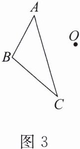 例 如图3,已知$\triangle ABC和点O$.在图中画出$\triangle A'B'C'$,使$\triangle A'B'C'与\triangle ABC关于点O$对称.写出两个三角形中的对称点、相等的线段和相等的角.