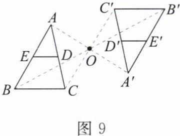2. 如图9,$\triangle ABC与\triangle A'B'C'关于点O$对称,$ED是\triangle ABC$的中位线,$E'D'是\triangle A'B'C'$的中位线.若$BC = 4$,则$E'D'$的长为(