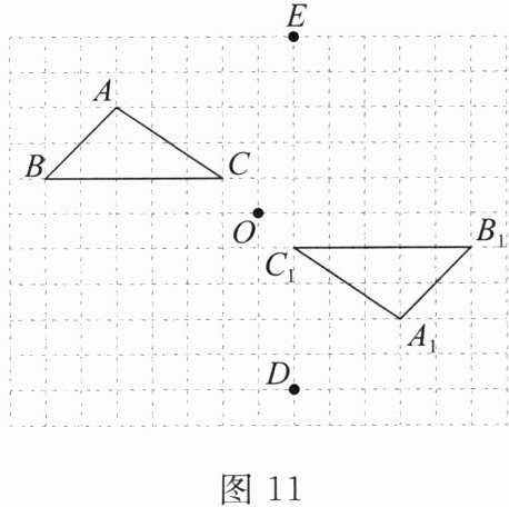 6. 如图11,网格中每个小正方形的边长都是1个单位长度,△ABC与$△A_1B_1C_1$关于点O对称。
