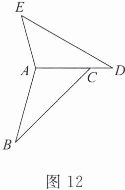 15. (14分)如图12,在△ABC中,∠B= 30°,∠ACB= 45°,AB= 3√2,△ABC绕一点按逆时针方向旋转一定角度后与△ADE重合,且点D恰好在AC的延长线上,AE= 3。