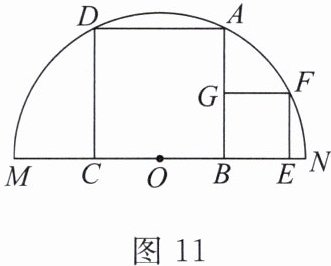 7. 如图11,MN是半圆O的直径,正方形ABCD中的点A,D在半圆O上,点B,C在直径MN上,正方形BEFG中的点G在AB边上,点F在半圆O上,点E在直径MN上。若正方形BEFG的边长为4,求⊙O的半径。