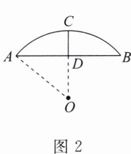3. 如图2,一座石拱桥的桥拱是圆弧形$\overset{\frown}{AB}$,$\overset{\frown}{AB}$所在圆的圆心为点O,⊙O的半径OA= 10m,桥拱的跨度AB= 16m,点D为AB的中点,连接OD并延长交$\overset{\frown}{AB}$于点C。则∠ADO=