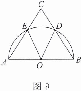 5. 如图9,O为等腰三角形ABC的底边AB的中点,以AB为直径的半圆分别交AC,BC于点E,D,连接OE,OD。