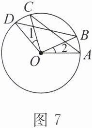 3. 如图7,已知A,B,C,D是⊙O上的点,∠1= ∠2。有下列结论:①$\overset{\frown}{AB}= \overset{\frown}{CD}$,②$\overset{\frown}{BD}= \overset{\frown}{AC}$,③AC= BD,④∠BOD= ∠AOC。其中,正确的结论有(