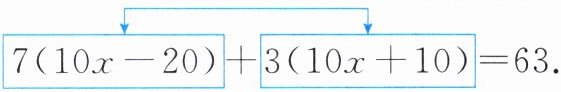 $7(10x - 20) + 3(10x + 10) = 63$。