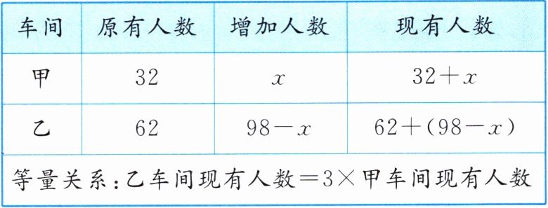 例3 某厂甲车间有工人32人,乙车间有工人62人,现从厂外又招聘98名工人分配到甲、乙两个车间.如何分配才能使乙车间人数是甲车间人数的3倍?