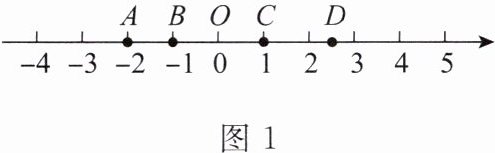 2. 如图1,数轴上有A,B,C,D四个点,其中,点____与点____表示的数的绝对值相等。