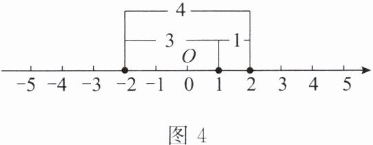 思考:由题意可知,在数轴上,数x的对应点即为与数1和-2的对应点的距离之和为5的点。因为在数轴上数1和数-2的对应点间的距离为3,所以数x的对应点在数1的对应点的右边,或在数-2的对应点的左边。当数x的对应点在数1的对应点的右边时,由图4可知,x= 2;同理,当数x的对应点在数-2的对应点的左边时,x= -3。所以x的值是2或-3。
