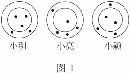 小明、小亮和小颖玩飞镖游戏,他们每人投镖5次,中靶情况如图1所示。规定投中圆环内得分相同,投中小圆内得分相同。若小明的得分为21分,小亮的得分为17分,则小颖的得分为______分。