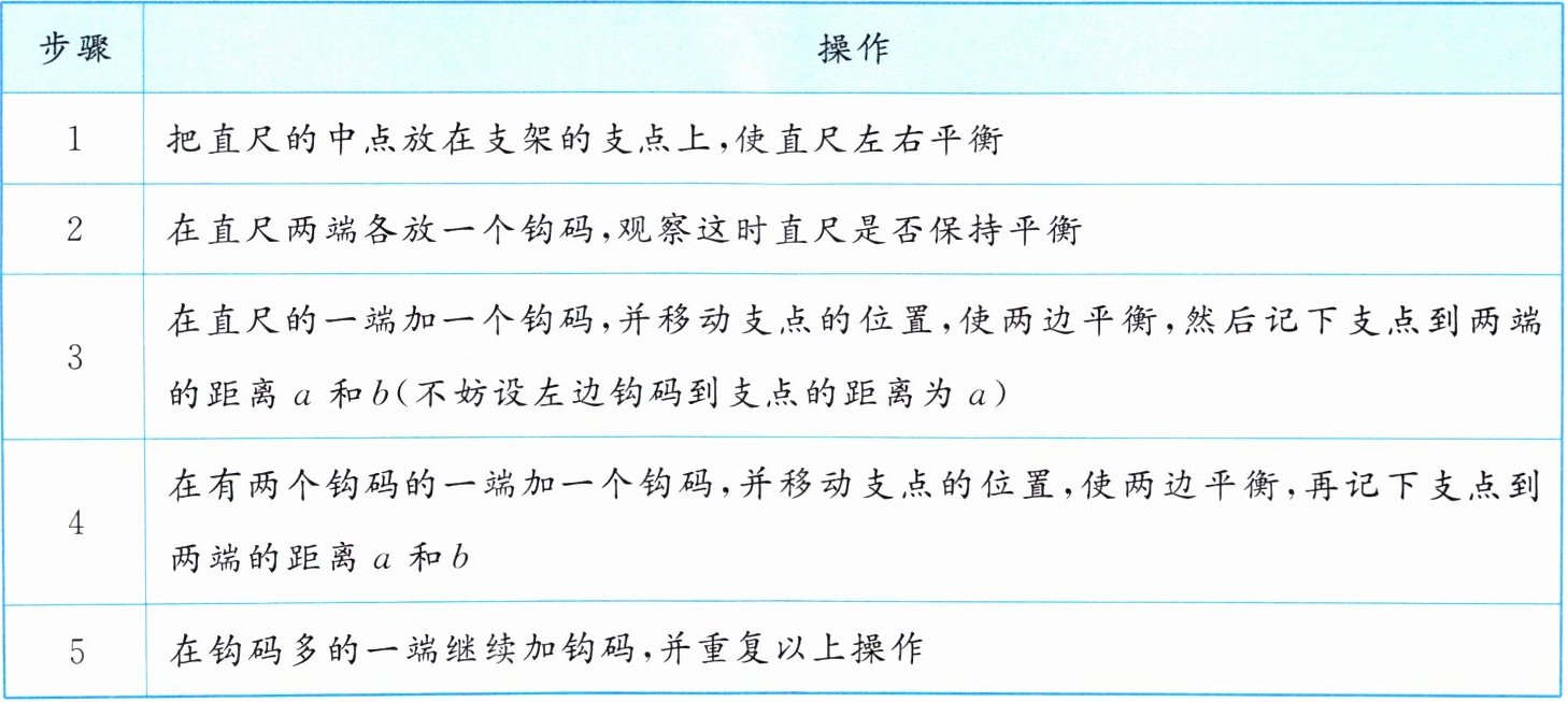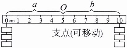 |3|在直尺的一端加一个钩码,并移动支点的位置,使两边平衡,然后记下支点到两端的距离$a和b$(不妨设左边钩码到支点的距离为$a$)|