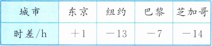 8. [跨学科题]下表列出了几个国外城市与北京的时差(正数表示同一时刻比北京时间早的时数,负数表示同一时刻比北京时间晚的时数,下列时间均为24小时制)。