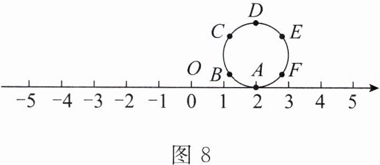 5. 如图8,周长为6个单位长度的圆上有六等分点A,B,C,D,E,F,点A落在数轴上表示数2的位置,将圆在数轴上沿负方向滚动,落在数轴上-2025处的是点____。