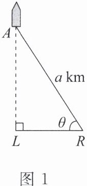 2024 年 5 月 29 日 16 时 12 分,长春净月一号卫星搭乘谷神星一号火箭在黄海海域成功发射。如图 1,当火箭上升到点 $ A $ 时,位于海平面 $ R $ 处的雷达测得点 $ R $ 到点 $ A $ 的距离为 $ a km $,仰角为 $ \theta $,则此时火箭距海平面的高度 $ AL $ 为____ $ km $。