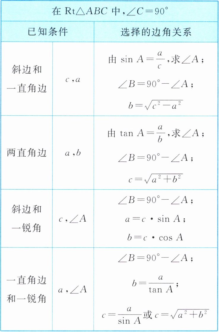 | 斜边和一直角边 $ c $,$ a $ | 由 $ \sin A = \frac{a}{c} $,求 $ \angle A $;$ \angle B = 90^{\circ} - \angle A $;$ b = \sqrt{c^{2} - a^{2}} $ |