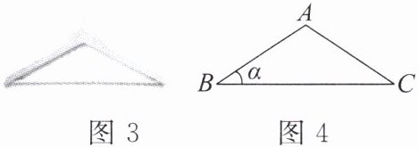 2. 图 3 是小夏同学家的一个衣架,它可以近似看成一个等腰三角形(如图 4 的 $ \triangle ABC $)。已知 $ AB = AC = 18 cm $,$ \angle B = \alpha $,则衣架的宽 $ BC $ 为( )。