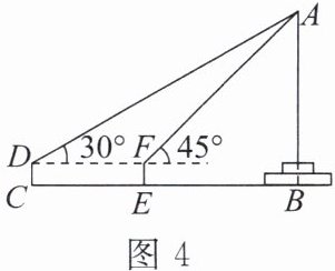如图 4,某数学兴趣小组准备测量校园内旗杆顶端到地面的高度(旗杆底端有台阶)。该小组在 C 处安置测角仪 CD,测得旗杆顶端 A 的仰角为 30°,前进 8 m 到达 E 处,安置测角仪 EF,测得旗杆顶端 A 的仰角为 45°(点 B,E,C 在同一直线上),已知测角仪支架高 CD = EF = 1.2 m,求旗杆顶端 A 到地面的距离。(结果精确到 1 m,参考数据:√3 ≈ 1.7)