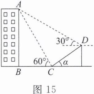 8. (2022 辽宁阜新中考)如图 15,小文在数学综合实践活动中,利用所学的数学知识测量居民楼的高度 AB。在居民楼前方有一斜坡,坡长 CD = 15 m,斜坡的倾斜角为 α,cos α = $\frac{4}{5}$。小文在 C 点处测得楼顶端 A 的仰角为 60°,在 D 点处测得楼顶端 A 的仰角为 30°(点 A,B,C,D 在同一平面内)。