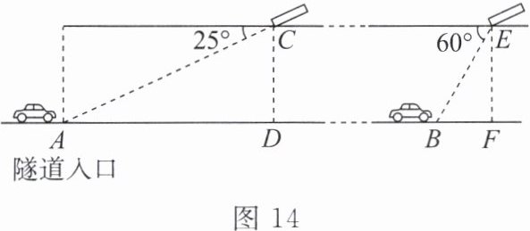 7. (2022 贵州贵阳中考)交通安全关系千万家。高速公路管理局在某隧道内安装了测速仪,图 14 是该段隧道的截面示意图。测速仪 C 和测速仪 E 到路面的距离 CD = EF = 7 m,测速仪 C 和 E 之间的距离 CE = 750 m。一辆小汽车在水平公路上由西向东匀速行驶,在测速仪 C 处测得小汽车在隧道入口 A 点的俯角为 25°,在测速仪 E 处测得小汽车在 B 点的俯角为 60°,小汽车在隧道中从点 A 行驶到点 B 所用时间为 38 s。(图中所有点在同一平面内)