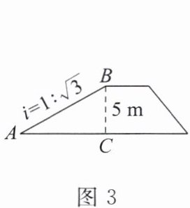 3. (2022 贵州毕节中考)图 3 是某地修建的一座建筑物的截面图,该建筑物的高$BC = 5$m,坡面$AB的坡度为1:\sqrt{3}$,则$AB$的长为( )。